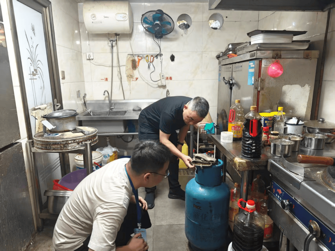 在万达广场中央华城美食一条街,重点检查部分用气餐饮场所燃气泄漏报警装置及切断阀安装情况,针对现场发现的“餐饮场所燃气泄漏报警器未规范安装”“液化气瓶无切断阀”等问题,要求立即整改,并加强日常巡查。