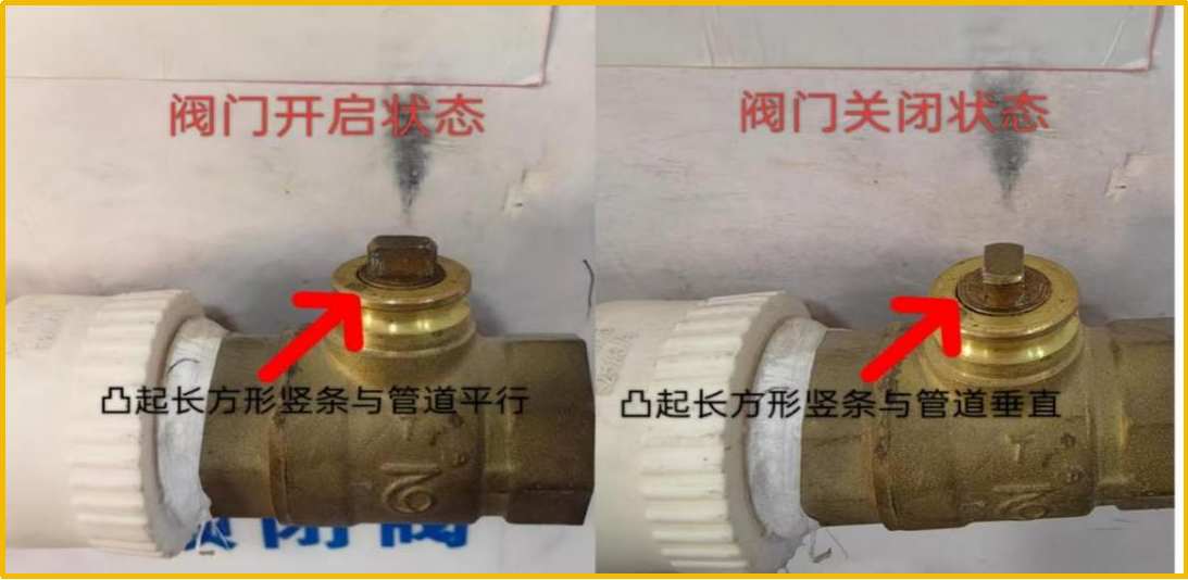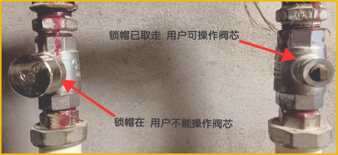 用户缴费后,我公司工作人员会第一时间上门开阀,如用户家中无人,为防止家中漏水造成不必要的损失,工作人员只提取锁帽,用户可自行选择合适时间开启阀芯:用扳手顺时针旋转锁闭阀凸起的长方形竖条,使其与管道平行即为开启,垂直则为关闭。(如下图)